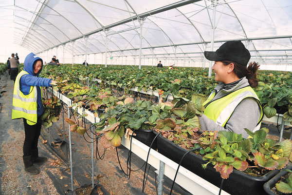 En photo : le personnel observe la croissance des fraises