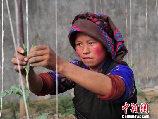Le 15 mars dernier, Mima Tsering, agriculteur-éleveur du bourg de Luojiang (Bainang, Shigatsé), transporte des pousses de pastèque dans ses serres familiales. Les locaux le surnomme ? Grand-père Pastèque ?.