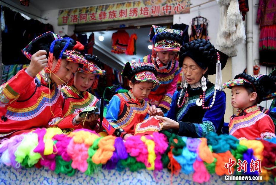 Photos prises le 15 avril, montrant Axiwuzhimo en train d'initier des enfants à la broderie de l'ethnie Li. En tant qu'héritière du patrimoine culturel immatériel de la broderie de l'ethnie Li, Axiwuzhimo a créé une coopérative au xian de Ganluo, situé dans la préfecture automne de l'ethnie Li de Liangshan, dans la province du Sichuan. L'établissement vise à aider les habitants locaux à vendre leurs ?uvres de broderie et à augmenter ainsi leurs revenus.