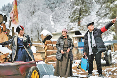 Après une forte chute de neige, Liu Xuecan (premier à droite) vérifie la situation post-catastrophe des bergers pauvres.