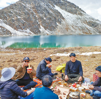 Liu Xuecan (deuxième à gauche) escalade un lac à une altitude de 5000 mètres avec des villageois, afin d'enquêter sur les conditions routières de la région.