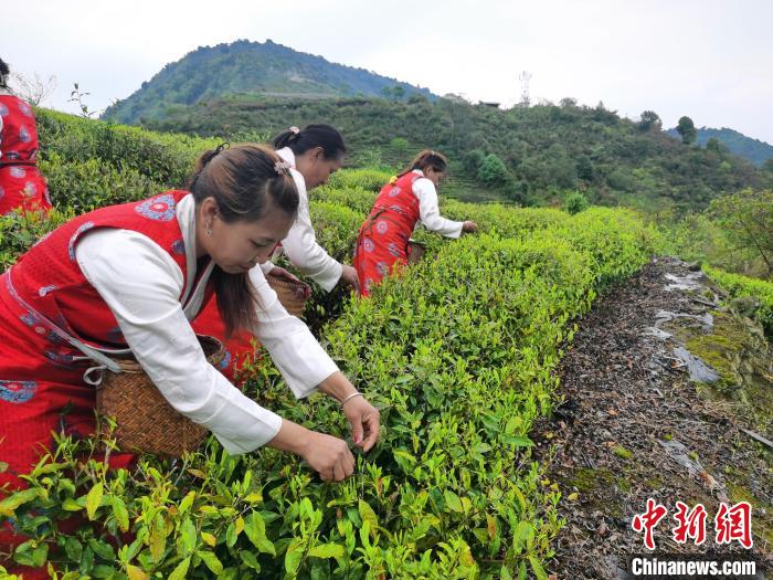 En ce moment, c'est la saison la plus chargée pour la cueillette du thé printanier. Les producteurs de thé vêtus de costumes nationaux traditionnels naviguent dans la plantation de thé qui s’étend à perte de vue. Ils cueillent savamment du thé de printemps frais et le mettent dans un panier en bambou attaché à leur taille.