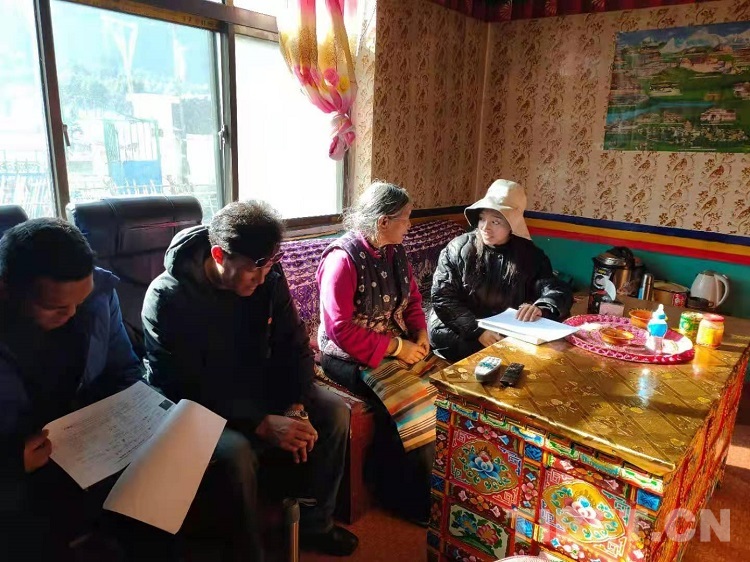 En photo : Phuntsok Drolma enquêtant sur la situation des ménages pauvres.