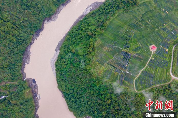 Une photographie aérienne de la plantation de thé dans le canton de Baibung, avec au loin la rivière Yarlung Zangbo.