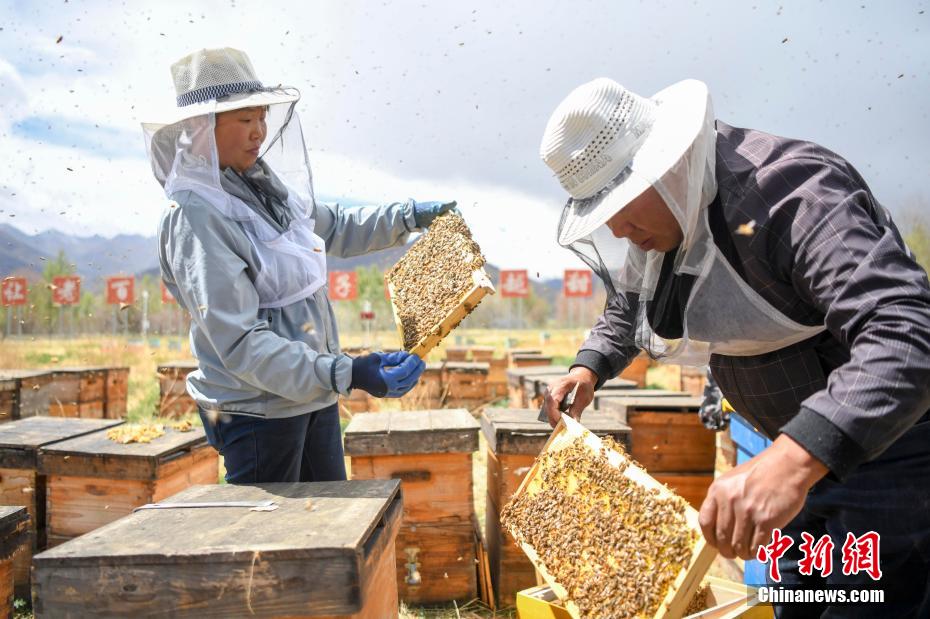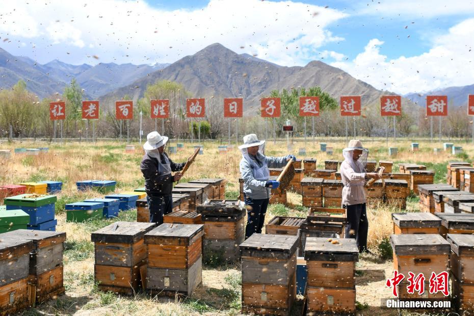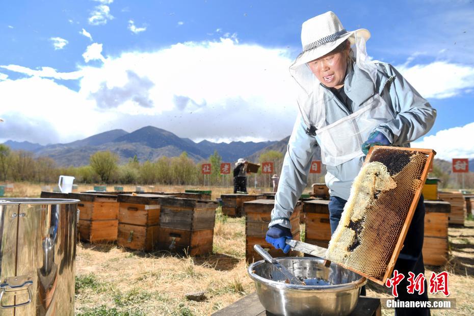 Le 28 mai, dans la base apicole de Dianfeng Gongmi, dans le comté de Gongga, ville de Shannan, à une altitude de 3650 mètres, le personnel recueille du miel.