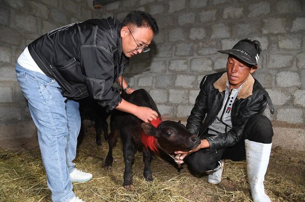 En photo : Sonam Jianshen (à droite) vérifiant la croissance des veaux. (Source des photos : China Tibet News)