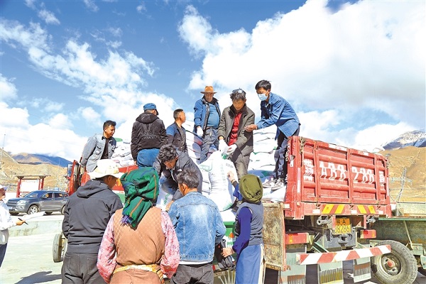 Le personnel du Bureau des affaires agricoles et rurales du district de Maizhokunggar distribuant des semences aux masses.