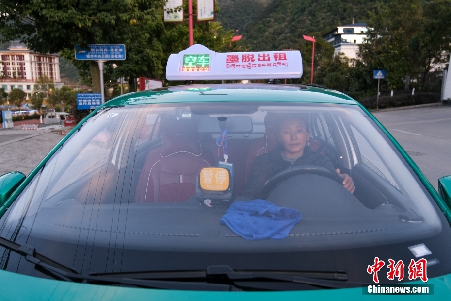 La photo montre Nyima Drolma, la seule femme chauffeuse de taxi lhopa du comté de Medog, se préparant à partir à la nuit tombée.