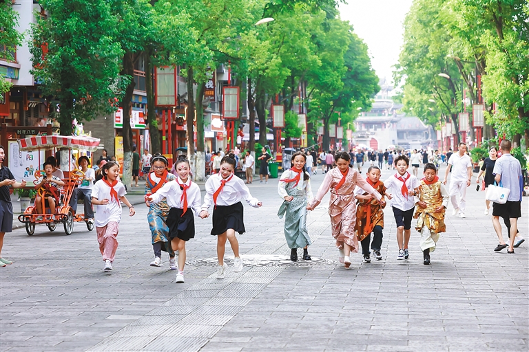 Des élèves des régions du Xizang et de Chongqing se tenant la main et courant dans les rues de la ville montagneuse.