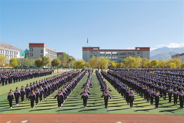 Des élèves du collège expérimental de Beijing à Lhassa faisant des exercices de gymnastique pendant la récréation.