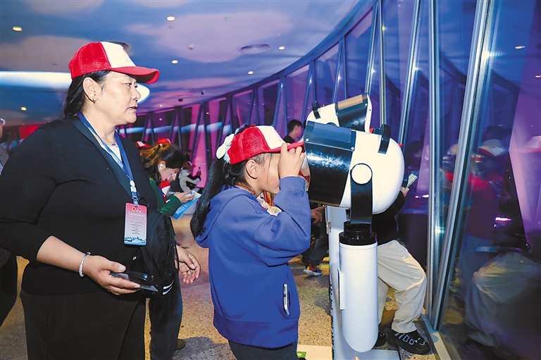 Des jeunes pionniers de Bomê participant à un camp d'hiver et utilisant un télescope pour admirer la vue nocturne de la ville de Guangzhou depuis la Tour de Guangzhou.