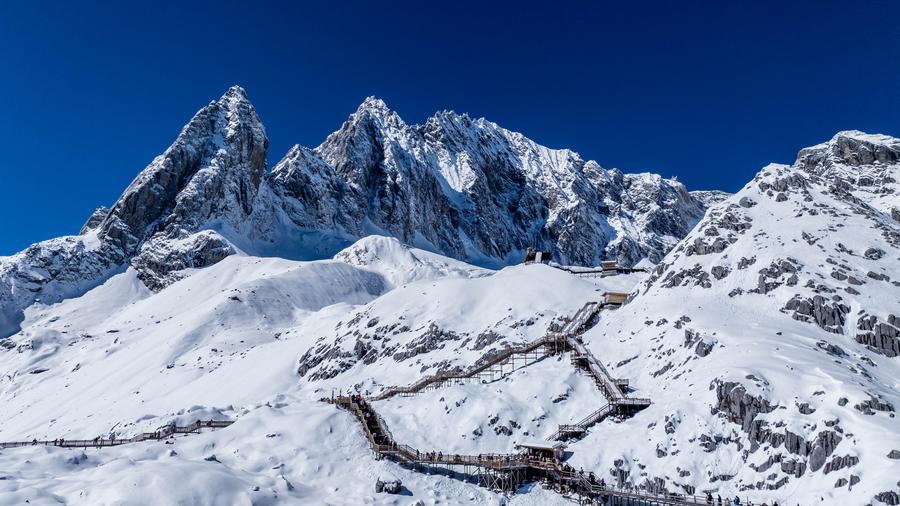 Photo aérienne de touristes visitant le mont Yulong enneigé, à Lijiang, dans la province chinoise du Yunnan (sud-ouest), le 9 novembre 2024. (Photo : Hu Chao)