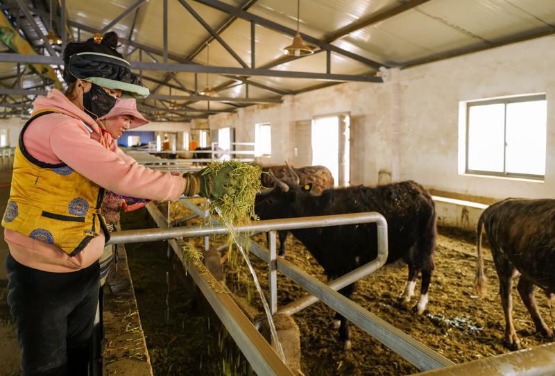 Au village de Xiaguo, dans le bourg de Zito, du comté de Lhorong, de la ville de Qamdo, le personnel de la base de démonstration agricole et d'élevage est à l'?uvre pour nourrir le bétail.