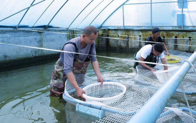 Les techniciens de la société agricole Nyingchi statefarm Karma procèdent à des contr?les réguliers pour suivre la croissance des poissons.