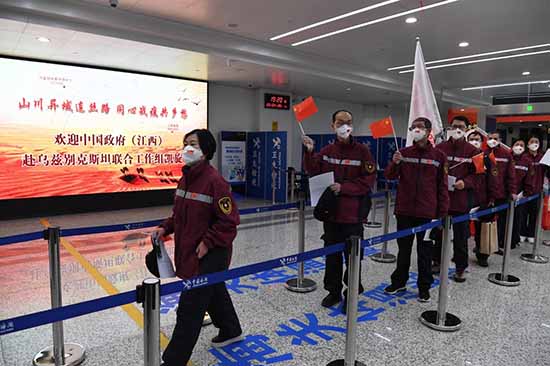 Le 28 avril 2020, dans la ville de Nanchang du Jiangxi, l'équipe conjointe de travail envoyée par la Chine en Ouzbékistan est rentrée à Nanchang par vol nolisé de l'Ouzbékistan après avoir accompli sa mission.