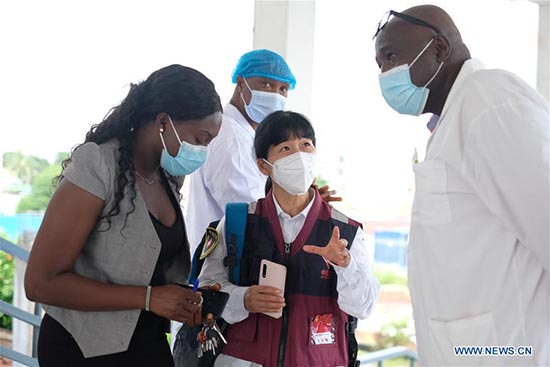 Un membre de l'équipe d'experts médicaux chinois propose des suggestions sur la prévention de l'épidémie de COVID-19 dans un h?pital de Conakry, en Guinée, le 29 ao?t 2020. (Photo / Xinhua)