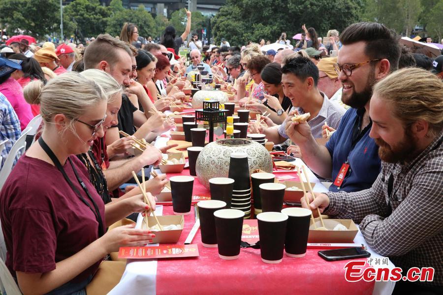 Un total de 764 personnes mangent des raviolis à Darling Harbour, à Sydney, en Australie, le 5 février, le premier jour du Nouvel An lunaire chinois. Elles ont établi un nouveau record du monde, battant le précédent record de 750 personnes atteint à Melbourne en 2013.