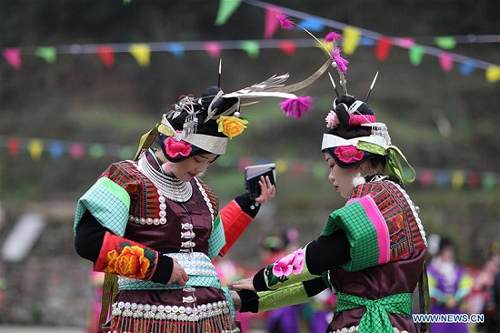 Des villageois en costumes traditionnels assistent à la célébration annuelle du lusheng au village de Yanying du comté de Danzhai, dans la préfecture autonome Miao et Dong de Qiandongnan, dans la province du Guizhou (sud-ouest de la Chine), le 18 janvier 2020. Le lusheng est un instrument à vent à anche. Les habitants se sont réunis ici pour célébrer l'arrivée de la Fête du Printemps, le 25 janvier prochain.