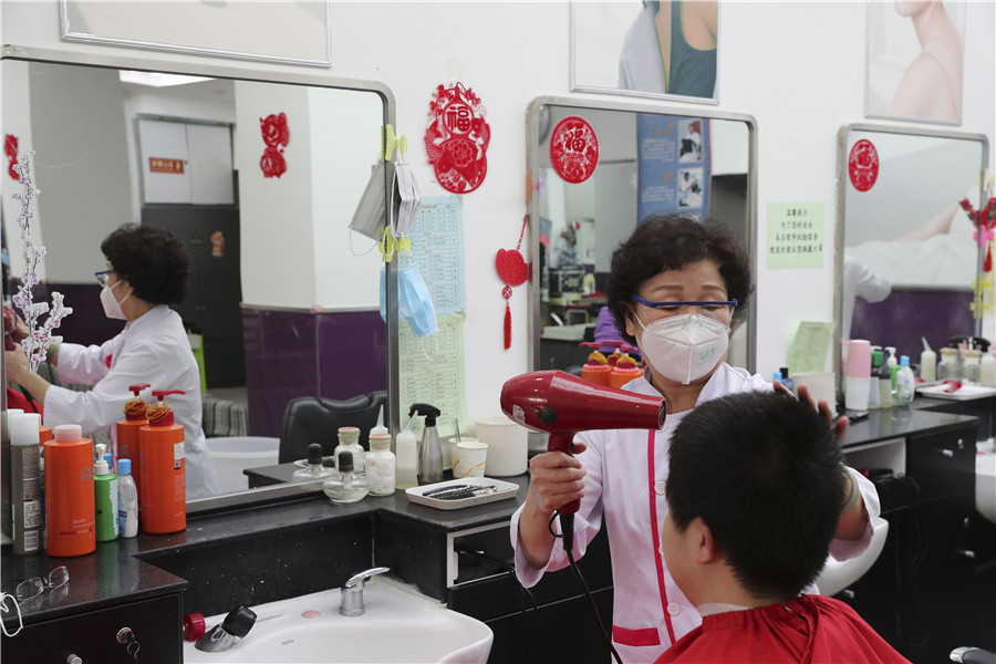 Un homme se fait couper les cheveux dans un salon de coiffure de Beijing, le 24 février 2020, journée qui marque la fête Longtaitou, ou fête du Dragon qui relève la tête. De nombreux Chinois croient qu'une nouvelle coiffure ce jour-là leur portera chance. Les barbiers et les salons de coiffure de la ville ont toutefois limité le nombre de clients et contr?lé la température de chaque personne pour assurer un environnement s?r au milieu de l'épidémie en cours.