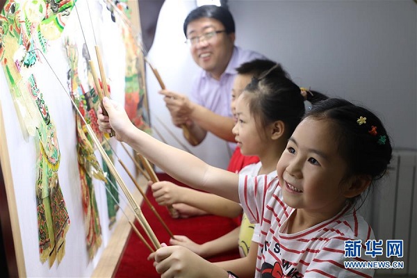 Photo prise le 27 juillet, montrant des enfants faisant l'expérience du théatre d'ombres chinoises auprès de Zhou Xuejun, héritier de cet art traditionnel, à Tangshan, dans la province du Hebei (nord). Des ateliers de découverte du patrimoine culturel immatériel chinois seront organisés pendant tout l'été dans cette ville pour enrichir les vacances des enfants. (Photos : Zhu Dayong/Xinhua)