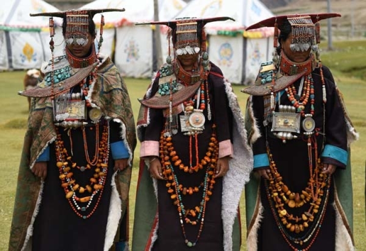 Le village de Kejia, dans le district de Burang de la préfecture de Ngari, au Tibet. Des femmes  portent d'anciens costumes ? Xuan ?.