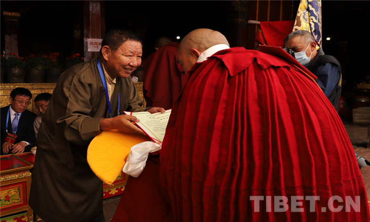 Sur les lieux de l'événement, Meng Xiaolin, vice-président de la région autonome du Tibet, a présenté des bandes de satin coloré, des fruits secs, des robes et des cadeaux aux moines dipl?més au nom du gouvernement populaire de la région autonome du Tibet. Le chef du Bureau des affaires religieuses de la région autonome du Tibet a distribué des aum?nes aux moines qui ont participé à la soutenance. Le responsable de la branche tibétaine de l'Association bouddhiste chinoise a prononcé un message de félicitations, offrant des khatas et décernant les dipl?mes aux moines dipl?més.