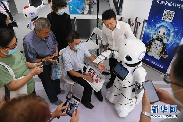 Photo prise le 7 septembre, montrant un robot en train de prendre le pouls d'un visiteur au Salon international du commerce des services de Chine 2020 (CIFTIS, China International Fair for Trade in Services), qui se tient actuellement à Beijing. Ce robot doté d'IA est capable d'offrir des services d'examen physique et de consultations médicales selon des méthodes de médecine traditionnelle chinoise. (Photo : Cai Yang/Xinhua)