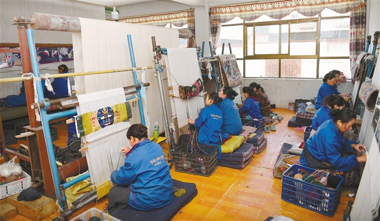 En photo : les artisans de la Coopérative de transformation de tapis tibétains Kadian de Nyima du canton de Nyangtod, dans le district de Gyangze, en train de tisser des tapis tibétains.