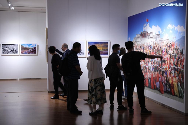 Des invités assistent à la cérémonie d'ouverture d'une exposition célébrant le 70e anniversaire de la libération pacifique du Tibet au Musée d'art Yanhuang de Beijing, le 21 mai 2021. Une exposition d'?uvres d'art et de photographies s'est ouverte le 21 mai à Beijing pour célébrer le 70e anniversaire de la libération pacifique du Tibet. L'exposition au Musée d'art de Yanhuang se compose de 86 photos artistiques créées au 21e siècle, représentant les paysages, les habitants et la culture du Tibet. L'exposition est parrainée par la Fédération chinoise des cercles littéraires et artistiques et sera gratuite pour le public jusqu'au 27 mai. (Jin Liwang / Xinhua)
