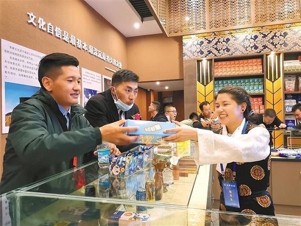 Dans la zone d'exposition des produits d'orge tibétaine, un membre du personnel présente les produits aux clients.