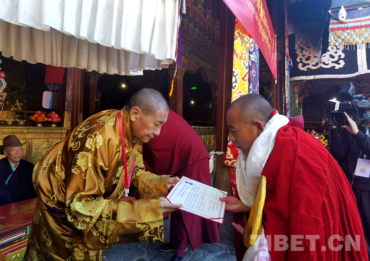 Ma Lizhu, secrétaire général adjoint du gouvernement populaire de la région autonome du Tibet, au nom du gouvernement populaire de la région autonome du Tibet, a présenté du satin coloré, des fruits secs, des soutanes et des cadeaux aux moines qui ont obtenu leurs diplomes. Dawa Chonda, directeur adjoint du Bureau des affaires religieuses de la région autonome du Tibet, a distribué des aum?nes aux moines qui ont participé à la soutenance. Drukhang Thubten Khedrup, vice-président exécutif de la branche au Tibet de l'Association bouddhiste de Chine et président du Collège bouddhiste du Tibet, a prononcé un discours de félicitations et, au nom du Panchen Erdeni Choskyi Gyalpo, a offert des hadas et a décerné les dipl?mes aux moines qui les ont obtenus.