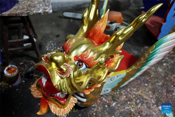 Des artisans travaillent dans l'usine de bateaux-dragons de Fangzhongxiong dans le village de Fangzhuang du canton de Nantong, dans le comté de Minhou, à Fuzhou, capitale de la province du Fujian (sud-est de la Chine), le 30 mai 2022. Le village de Fangzhuang, connu sous le nom du ? village des bateaux-dragons ?, fabrique des bateaux-dragons depuis plus de 700 ans.