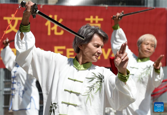 Des amateurs d'arts martiaux donnent un spectacle de danses traditionnelles chinoises de l'épée et du dragon lors du Festival culturel de Shaolin à Vienne, capitale de l'Autriche, le 11 juin 2022.