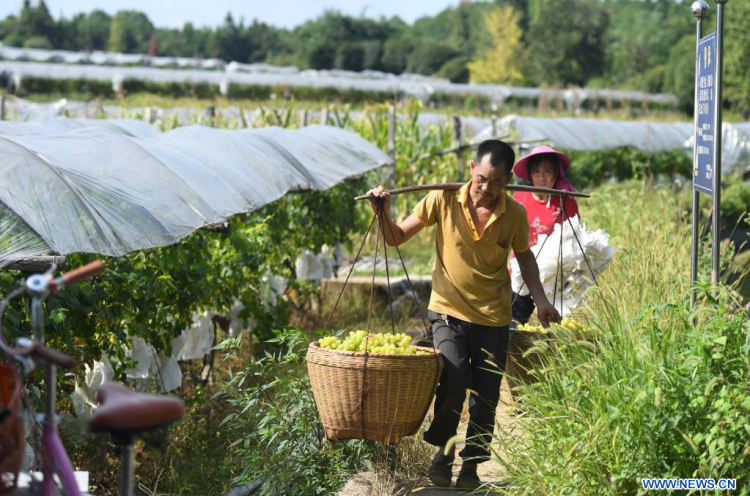 Des villageois récoltent des raisins dans un vignoble du village de Maozhushan du bourg de Caiwan dans le district de Quanzhou, dans la région autonome Zhuang du Guangxi (sud de la Chine), le 23 ao?t 2022. Récemment, plus de 2 000 mu (133 hectares) de champs de vigne sont entrés dans la saison des récoltes ici. (Xinhua/Lu Boan)