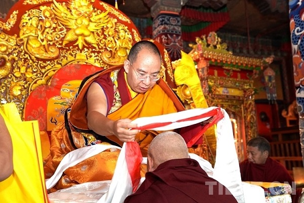 Une fois à l'intérieur du grand hall, le panchen Rinpoche a d'abord offert un khata en signe de respect à la statue du 5ème Dala? Lama, Ngawang Lozang Gyatso. Selon les informations, en 1622, sous la direction du 4ème panchen, Ngawang Lozang Gyatso fut reconnu comme la réincarnation et accueilli au monastère de Drepung. Dans le grand hall de Tsomchen, le panchen Rinpoche a également rendu hommage successivement au Champa Tongzhen Lhakhang, au Miwang Lhakhang, et s'est rendu à Kangyur Lhakhang pour s'informer de l'état de préservation du sutra ? Kangyur ?.