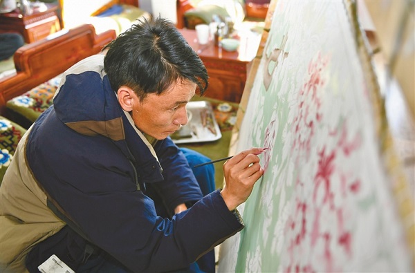 Les peintres de l'Académie de peinture de thangka du Xizang sont en train de créer des thangkas sur de nouveaux thèmes.
