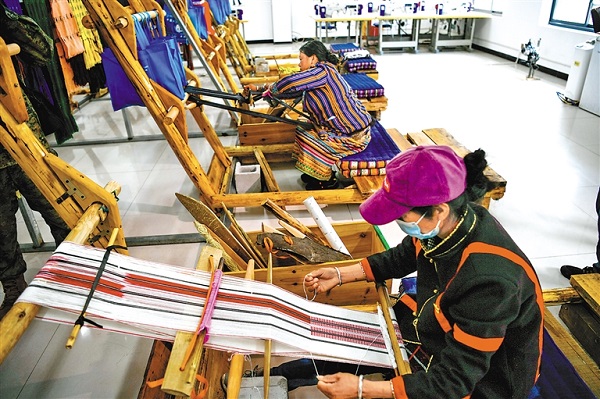 Les ouvriers de la coopérative de tissage d'agrculteurs et de bergers Lhopa du village de Qionglin, canton ethnique Lhopa de Nanyi, comté de Mainling, ville de Nyingchi, sont en train de tisser des tissus.