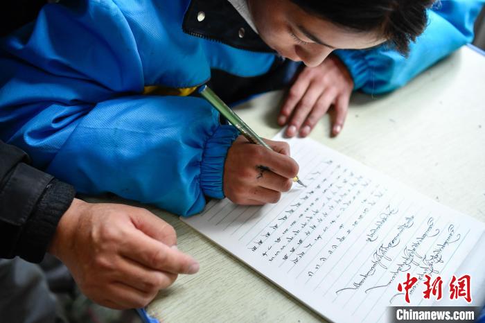 Des élèves du collège de Nyêrong apprenant la calligraphie tibétaine sous la direction de leurs professeurs.