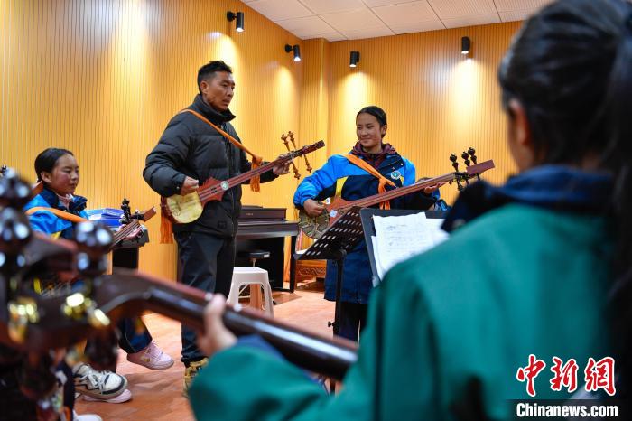 Photo d'élèves du collège de Nyêrong apprenant à jouer du zhanian sous la direction de leurs professeurs.