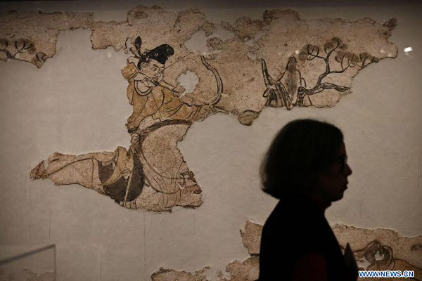 Une personne passe devant une peinture lors de l'exposition intitulée "La Chine des Tang -- Une dynastie cosmopolite (VIIe-Xe siècle)" au Musée national des arts asiatiques Guimet en France, le 18 novembre 2024. (Xinhua/Gao Jing)