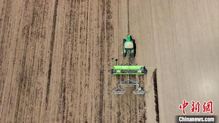 La photo montre un engin agricole semant l'orge tibétaine. (Photo prise par un drone)