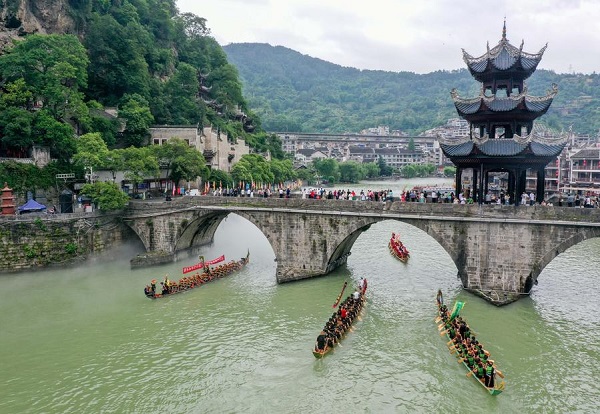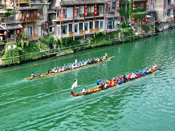 Des habitants pagayent sur des bateaux-dragons dans la vielle ville de Zhenyuan, dans la préfecture autonome Miao et Dong de Qiandongnan, dans la province chinoise du Guizhou (sud-ouest), le 20 mai 2025.(Photo : Ou Dongqu)