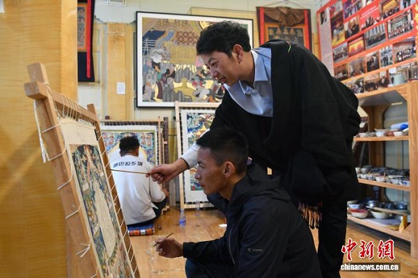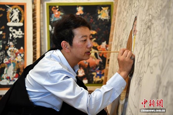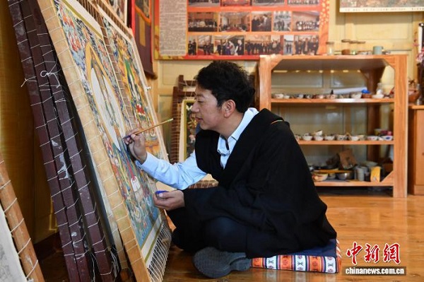 Le peintre de Thangka Zhuozhuo en plein processus créatif d'une ?uvre dans son atelier.
