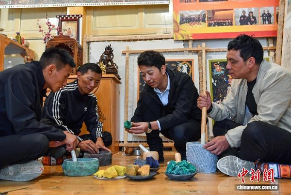 Zhuozhuo explique à ses élèves l'utilisation des pigments minéraux naturels.