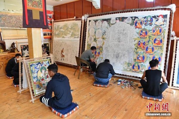 Des élèves en train de peindre un thangka dans l'atelier.