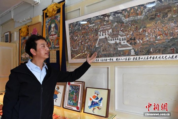 Zhuozhuo présente ses ?uvres de thangka.