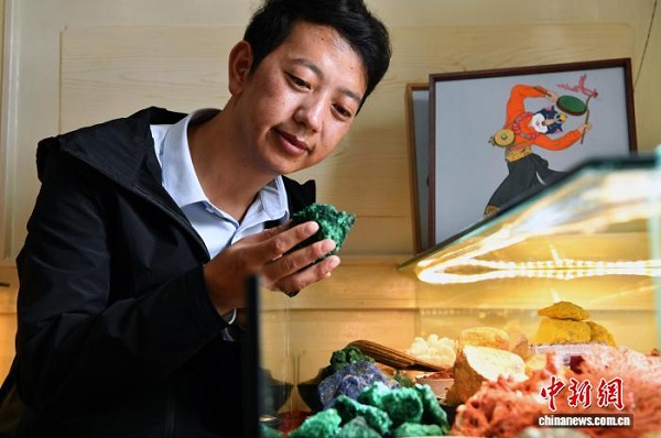 Zhuozhuo sélectionne des minéraux naturels dans son atelier.