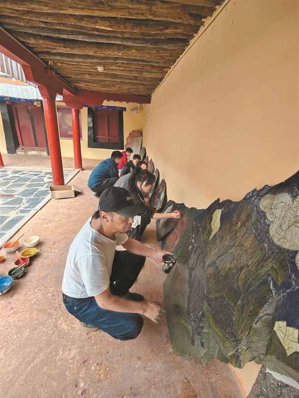 De l'estrade au chevalet, de la salle de classe aux chantiers de restauration des anciens édifices, Gyatso, artiste de premier rang, retrace du bout des doigts le fil millénaire de la peinture décorative tibétaine ; depuis deux décennies, il se consacre sans relache à l'éducation professionnelle, y semant la culture et perpétuant la flamme de la tradition. Tel un ? dougong ?, ces embo?tements sculptés qui soutiennent silencieusement l'architecture tibétaine, il ?uvre dans la discrétion mais porte solidement la transmission de l'art pictural tibétain, la continuité de ce patrimoine culturel, et l'engouement de la jeune génération pour renouer avec les savoir-faire ancestraux.
