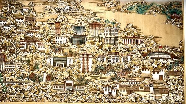 ? Représentation d'une scène florissante sur grand rouleau coloré sur toile – le chapitre de Chamdo ?, ?uvre de Tseten Jigme