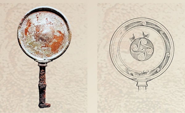 Miroir en bronze à manche, mis au jour dans les tombes à chambres funéraires en pierre de Qoigong, à Lhassa (début de l'age du métal au Xizang), le revers du miroir est ciselé de motifs de yaks et d'oiseaux appariés. Photo fournie par Li Yongxian.